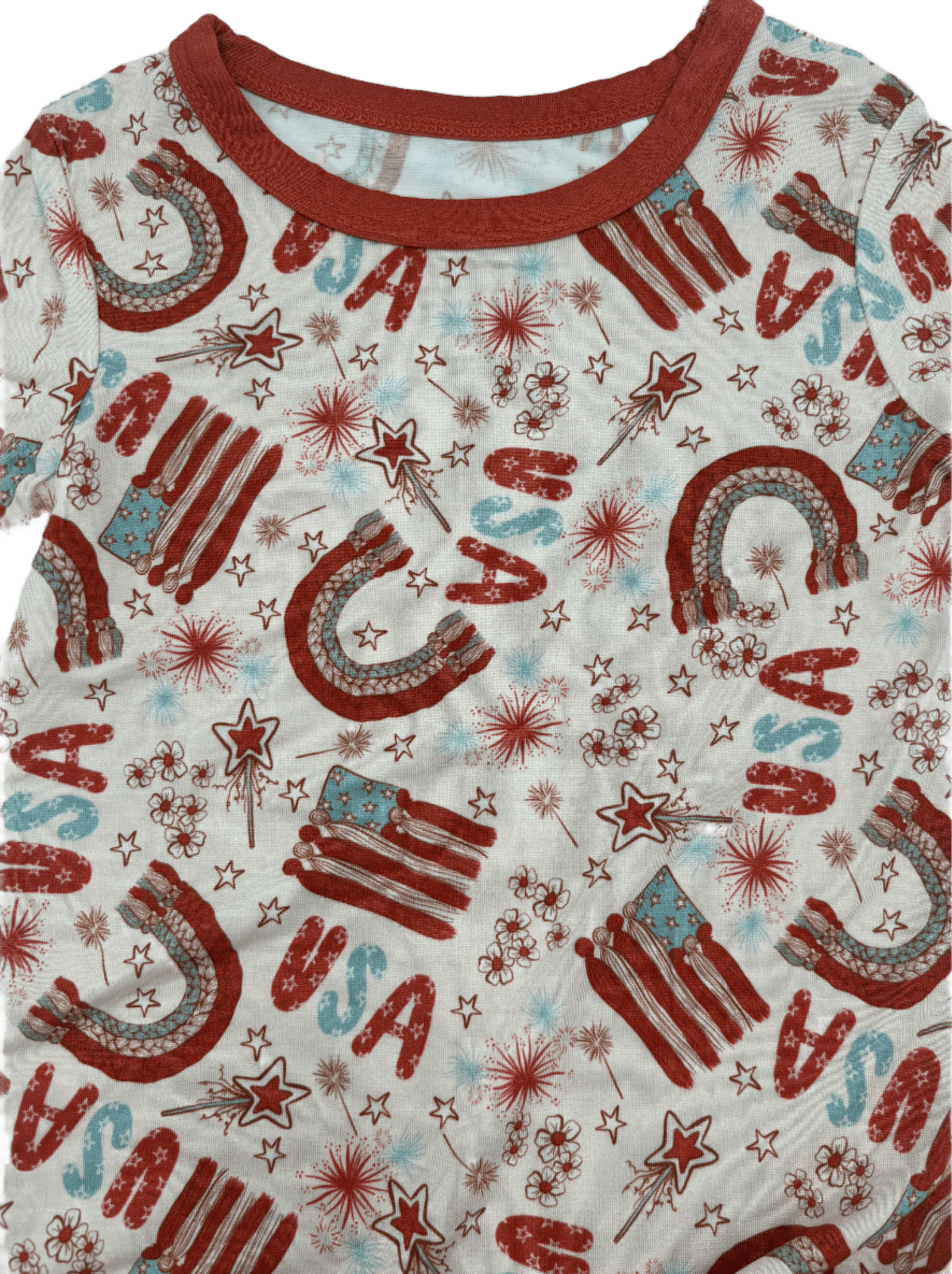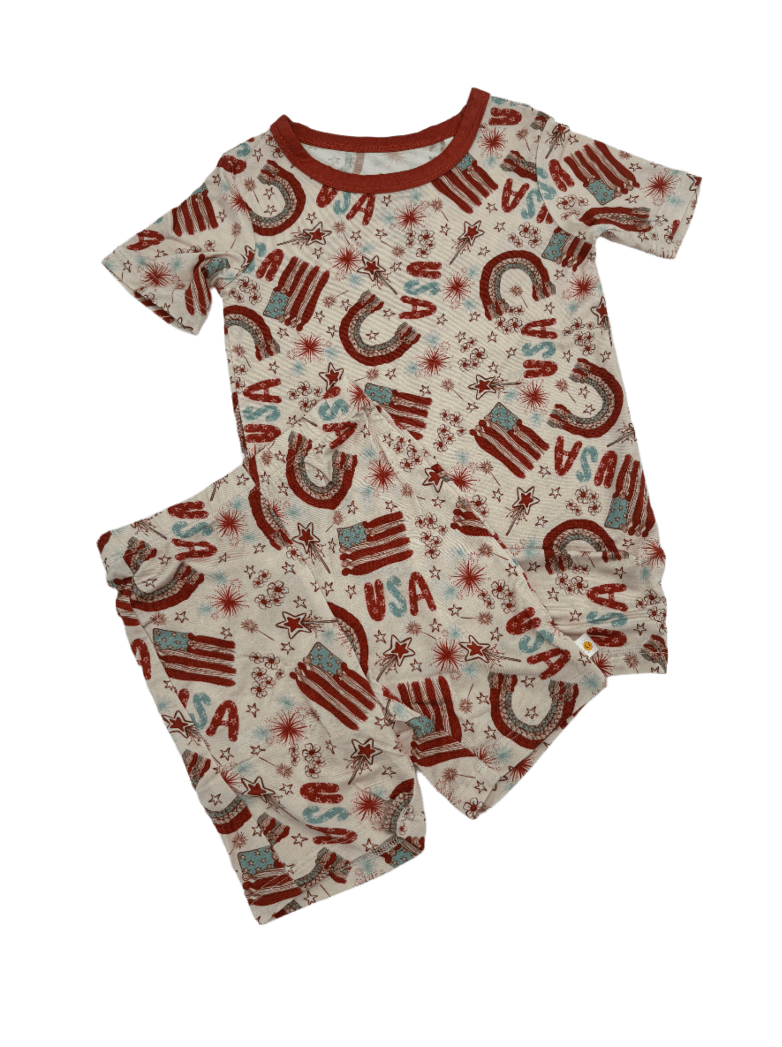 Wrap your little ones in the comfort of our "Boho Fourth of July 2-Piece Shorts Set" and make their bedtime joyful and fun. Ideal for cozy nights in, these pajamas not only ensure a restful sleep but also keep your child looking cute and feeling great. Celebrate Independence Day by giving the gift of comfort and fun with these delightful pajamas.